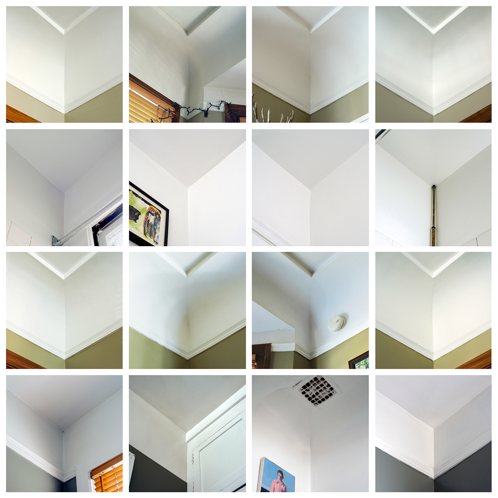 Home Coordinates are a series of sixteen photographs (19" square each) of the upper corners of the four main rooms of the my apartment. An attempt to map a familiar space in order to create an unfamiliar lived geometry.