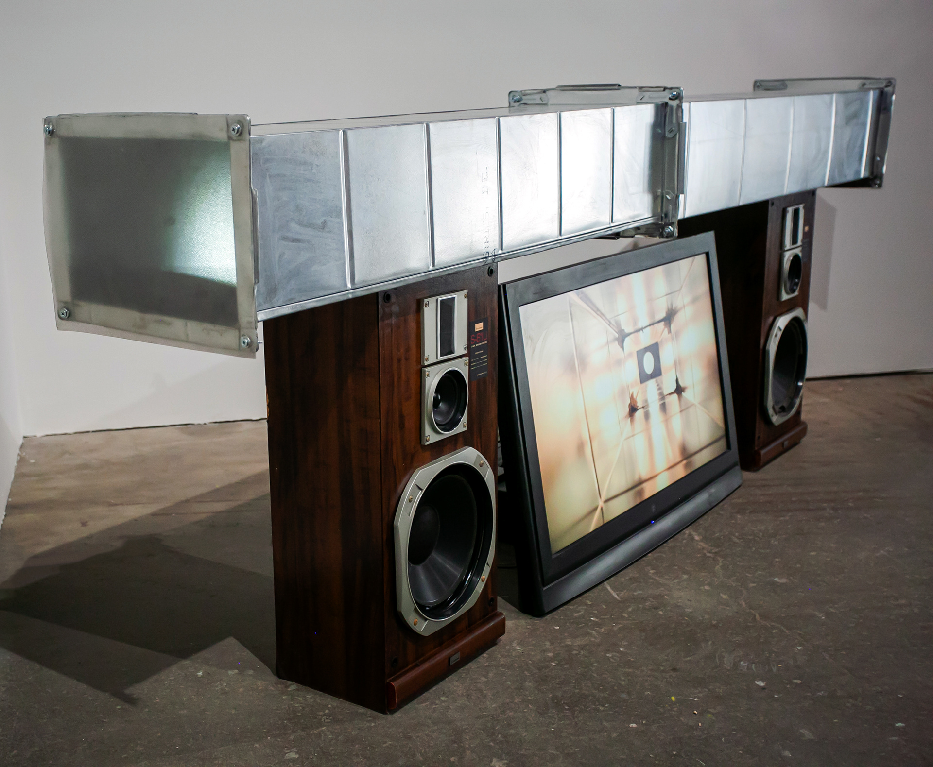 documentation of No Escape, 9ft air duct capped with semi-translucent plastic sheets on either end, eufy with light mounted inside, stereo receiver with 2 speakers as pedestal, stereo pair, & looped HD 5:30 min:sec video with sound