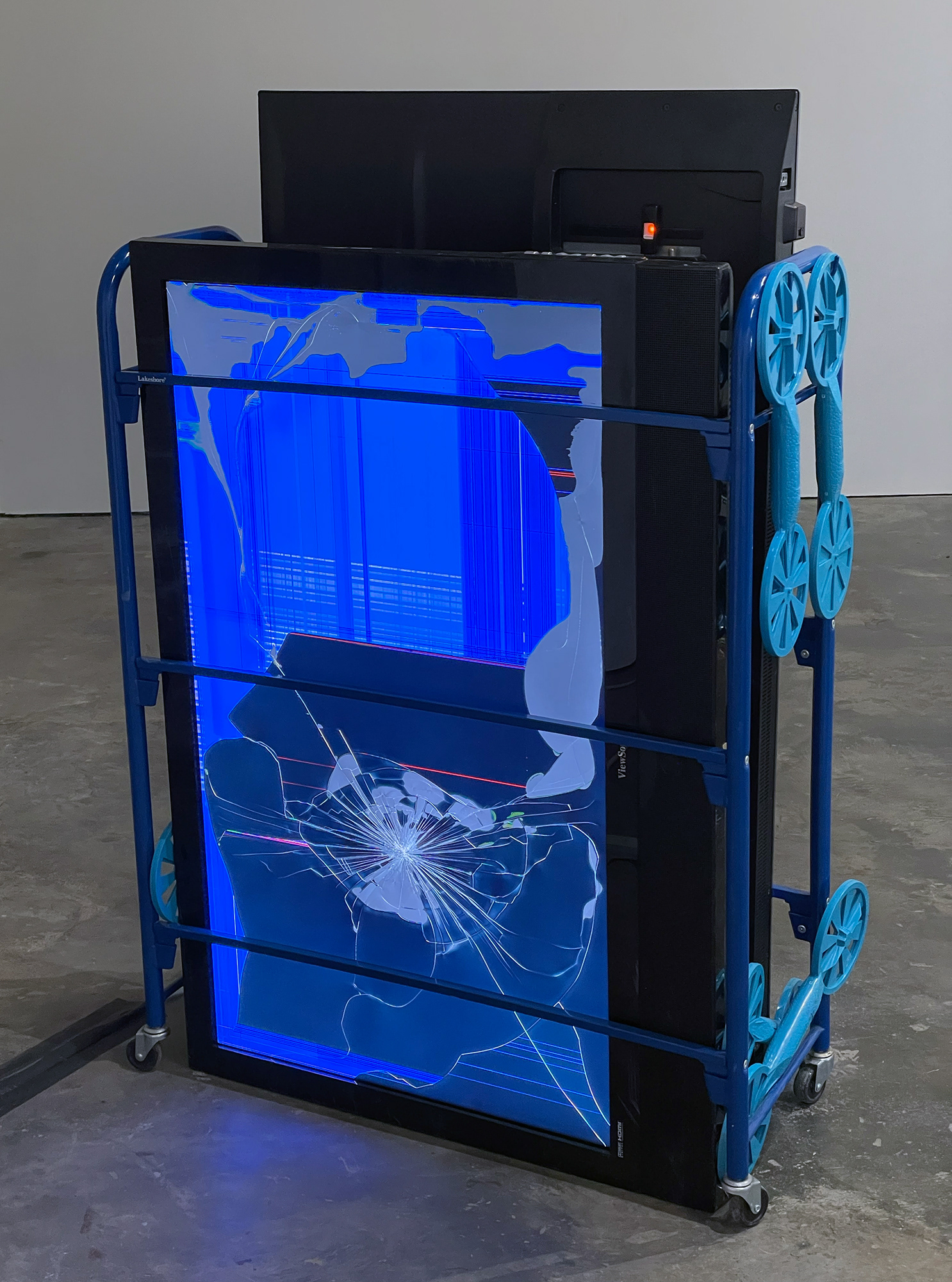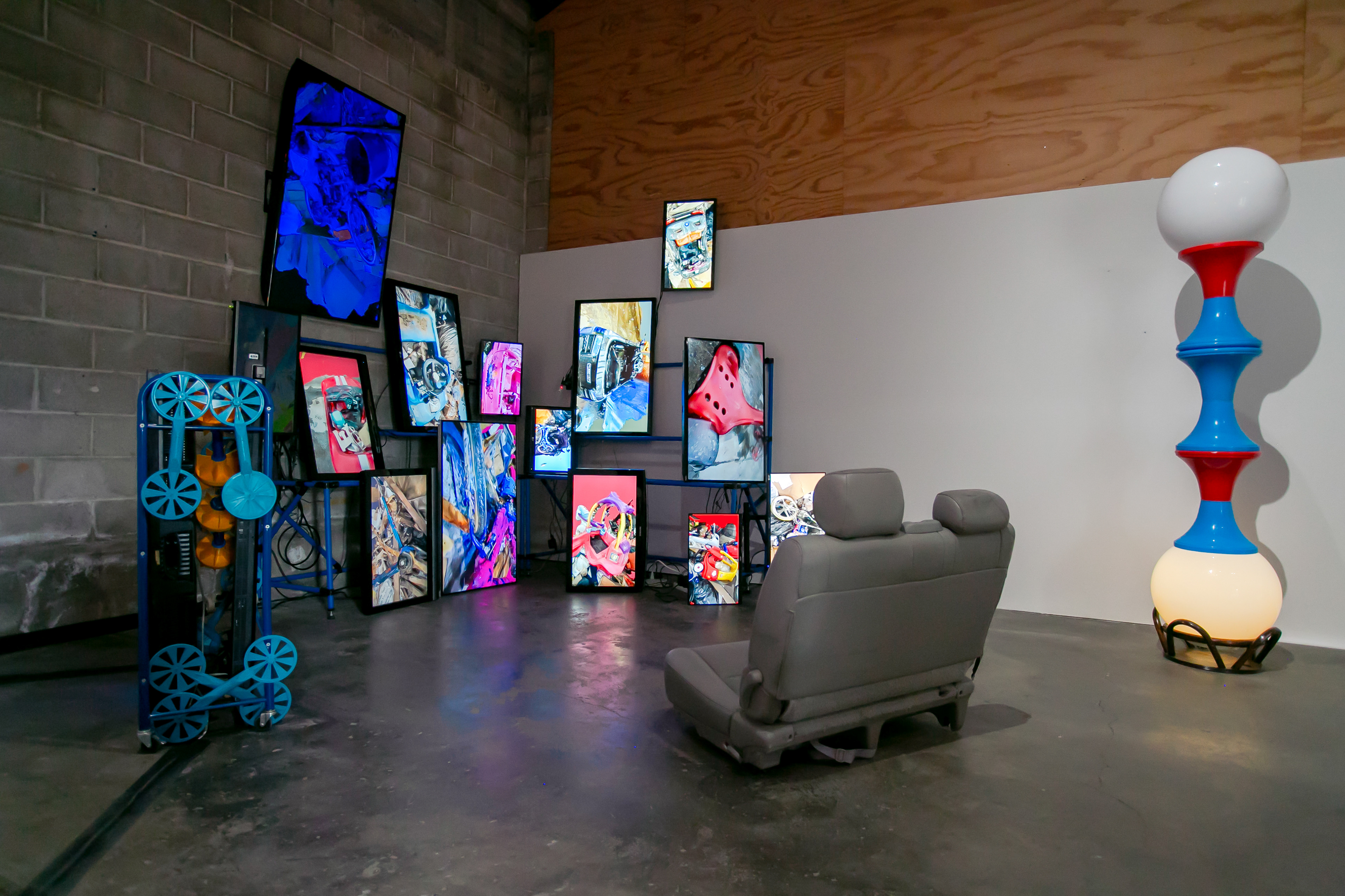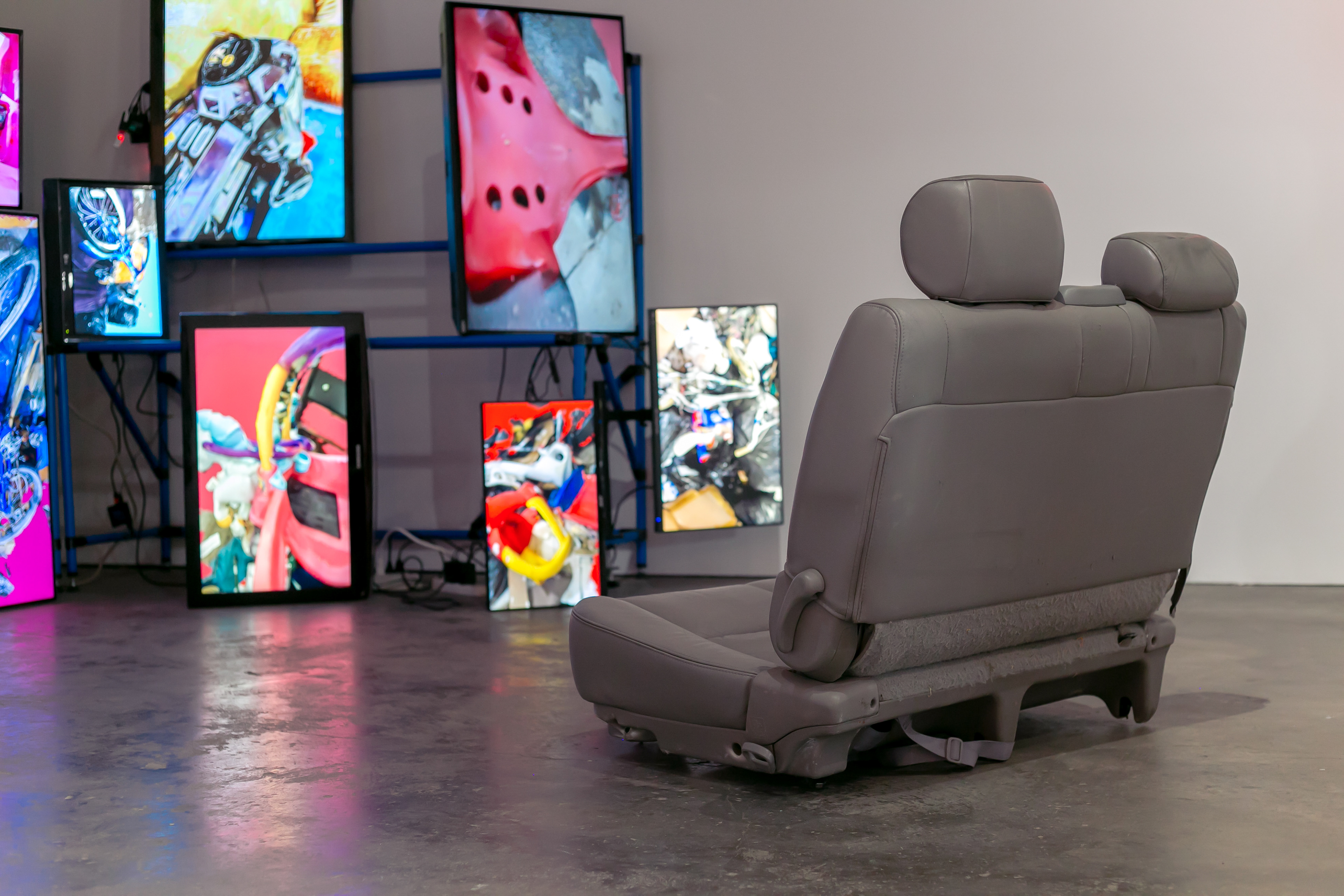 documentation of Crash Satellite, 2 broken monitors of roughly similar weight, plastic aquatic work-out equipment, & metal bin and Crash, 14 monitors of varying dimensions mounted on blue scaffolding in corner, 3D animations, & car seat