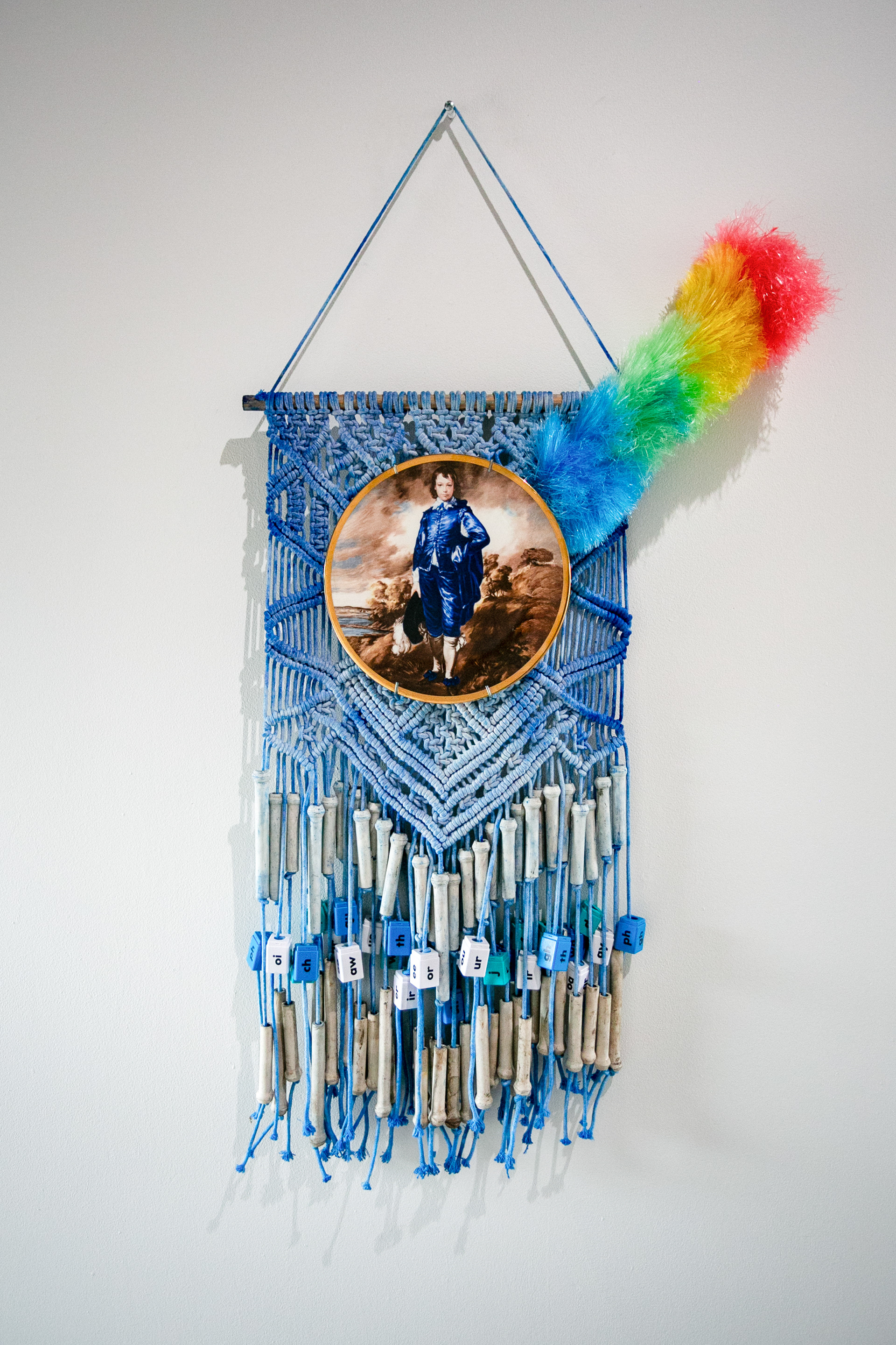 documentation of Domestic Bliss: Blue Boy Macramé, decorative plate, dyed macramé, ceramic tubes, plastic blocks, plastic duster, & headphones