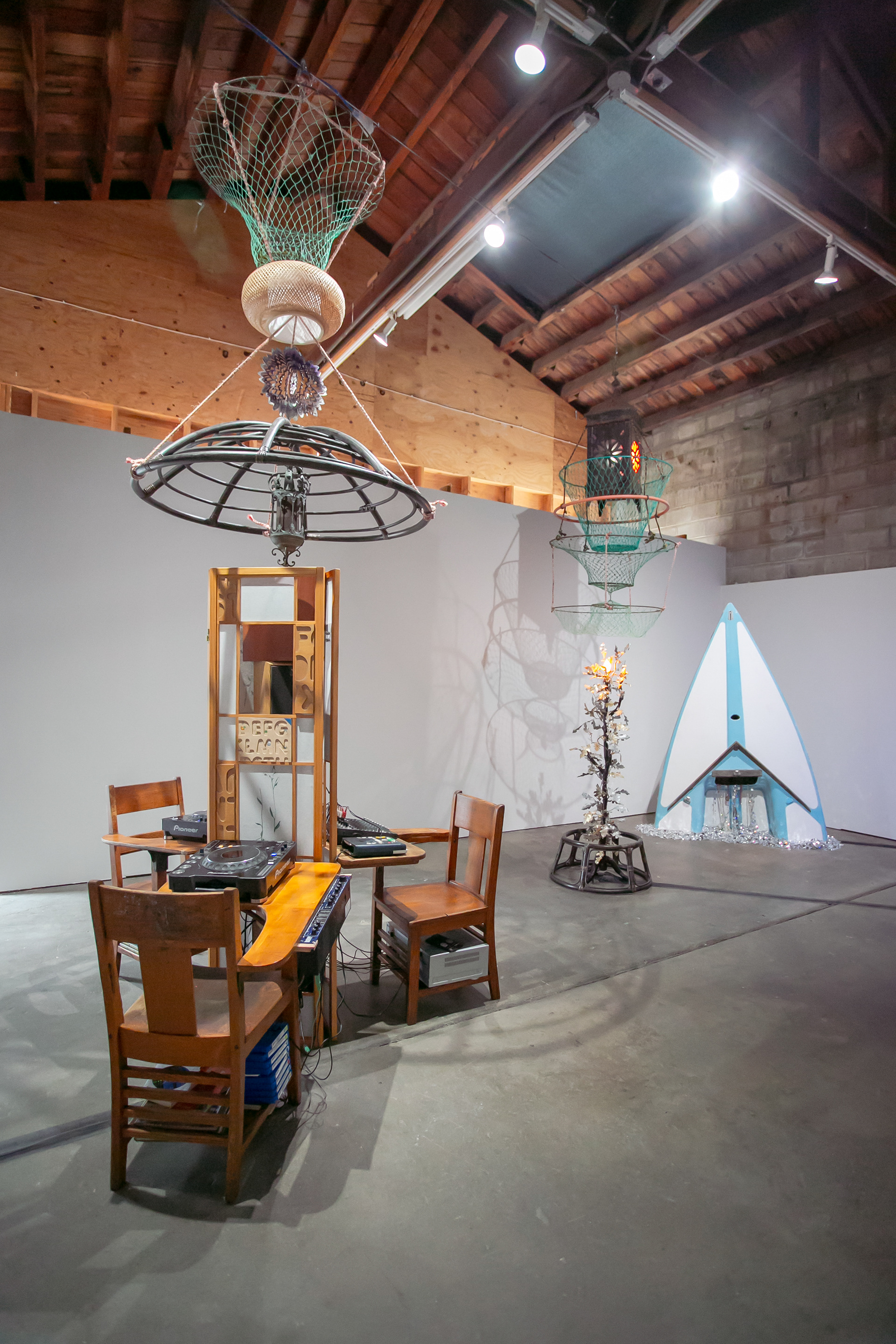 documentation of Audio Book Cut Up Station and performance, 3 wooden school desks, 5 stacked speakers, altered screen, Alexa in a metal cage, 2 Pioneer CDJ-1000MK3 CD players & audio book CDs, Library of Congress Audio Book reader & 9 audio book cartridges, Lexicon MX200 effects box, Mackie mixer, crab net, wicker lamp shade, wind catcher, furniture structure, rope, & supporting audio wires