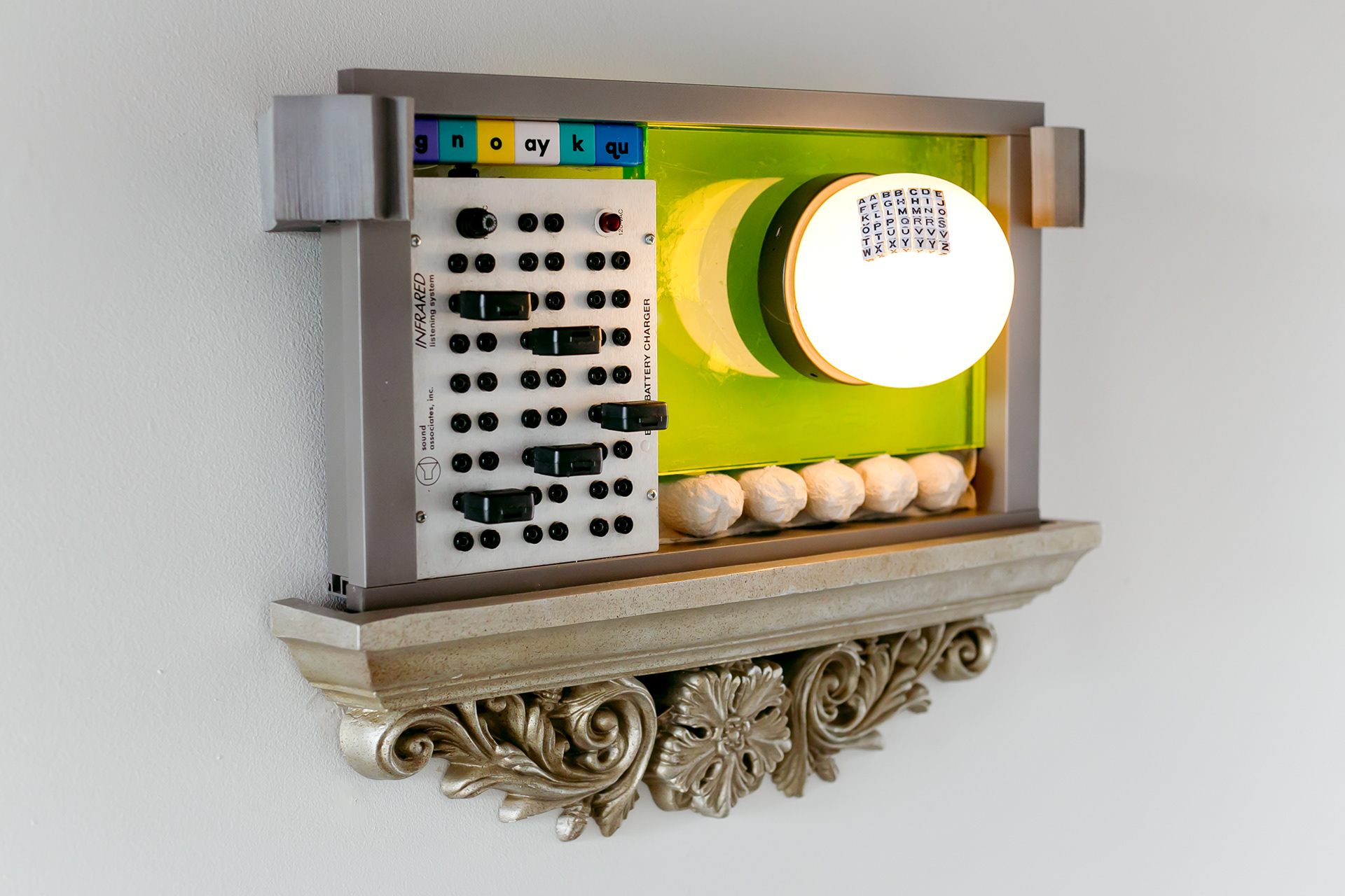 documentation of Listening Systems, plastic shelf, window with foam holders, green glass, rechargeable egg light, infrared listening system controller, plastic alphabet beads, & egg crate